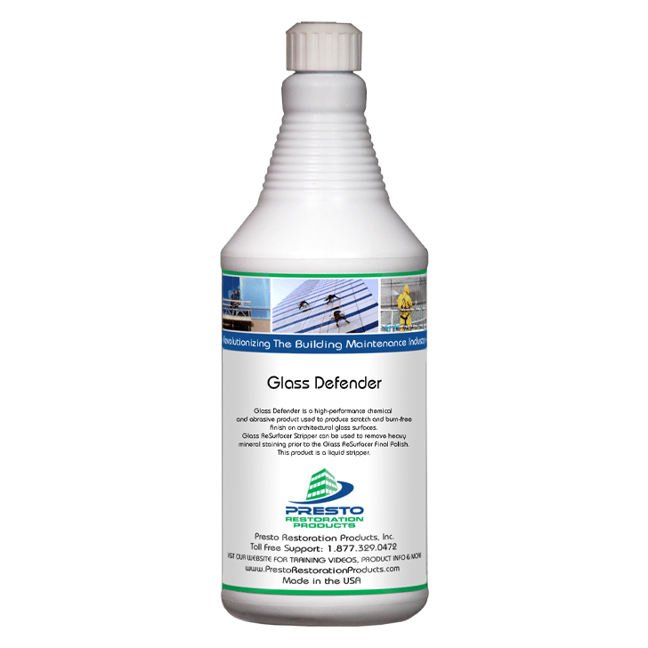Protection performance warranties are contingent upon using either Presto’s EnviRestore Glass Stain Remover or Glass ReSurfacer Final Polish to prepare the glass surface immediately before the application of Glass Defender. Remove all dirt from the surface. The level of protection will be sacrificed if all contaminants are not removed before use. Be sure to polish the glass surface with a rag to remove all restoration product residues. Do not use detergents on the glass between the restoration and the application of Glass Defender products. Apply the product immediately after the glass restoration process has been completed.